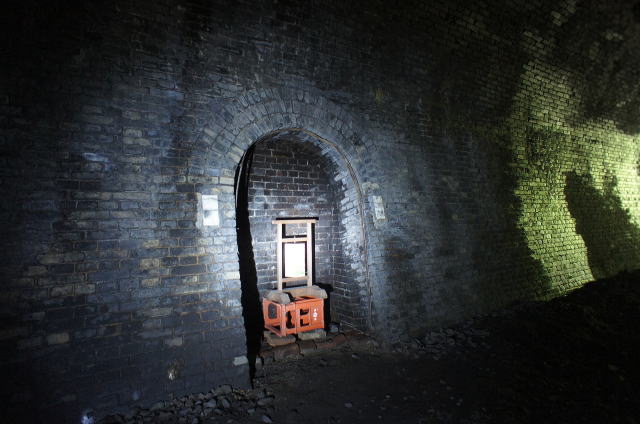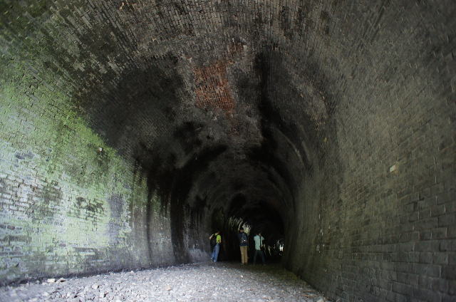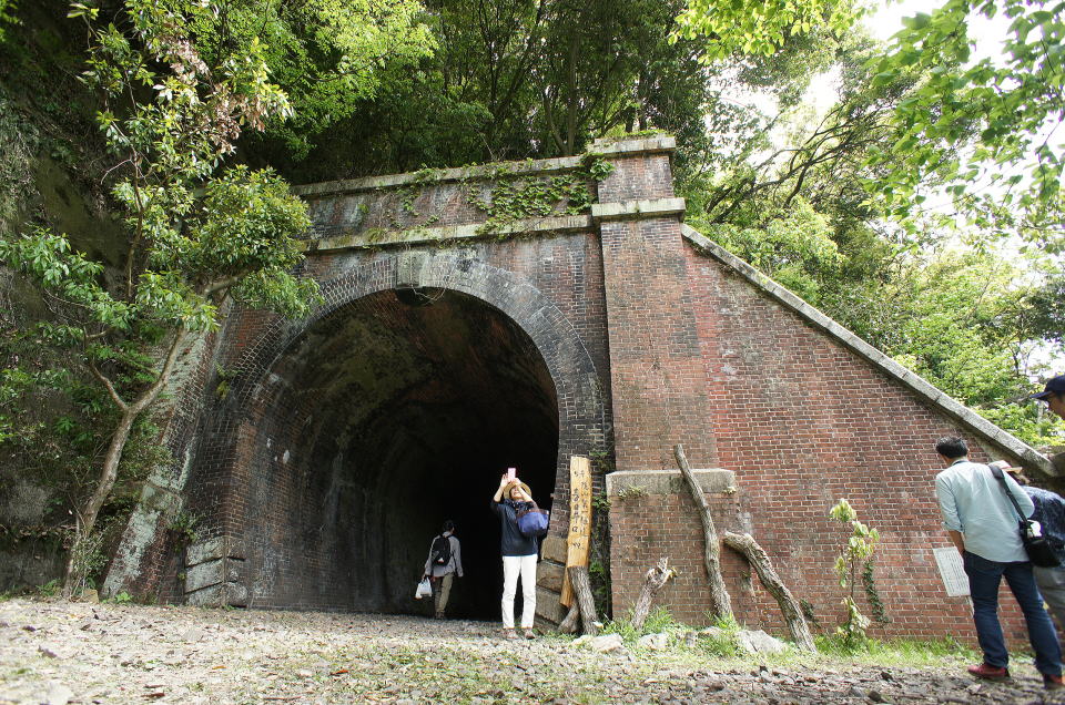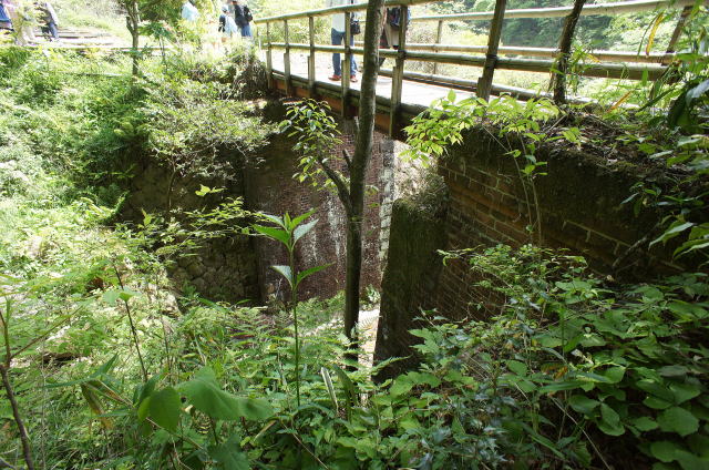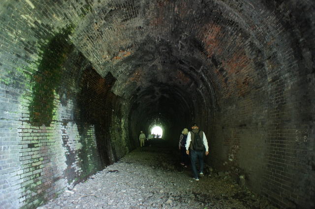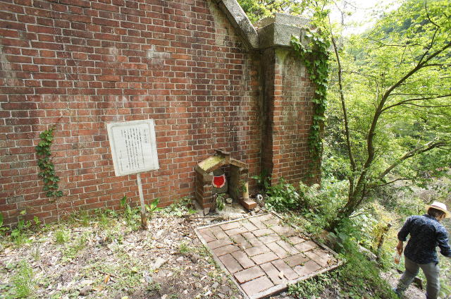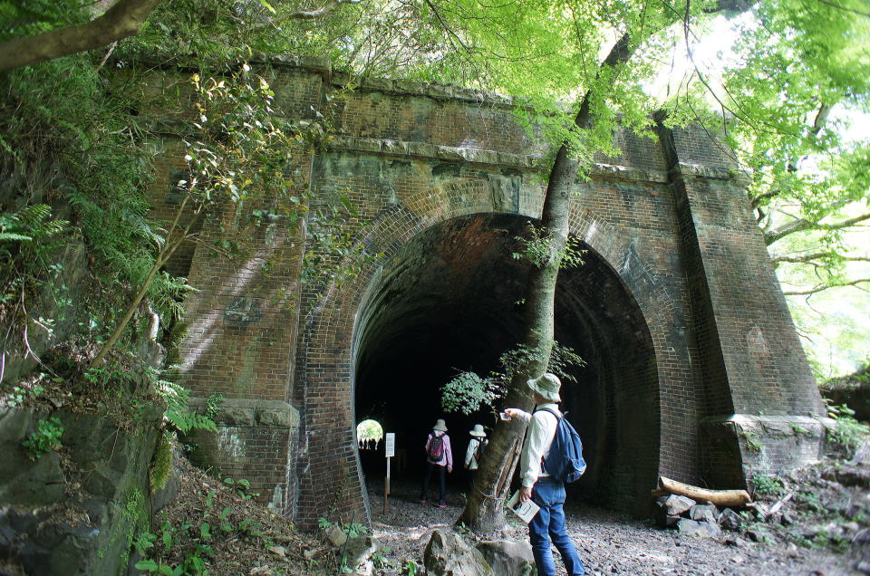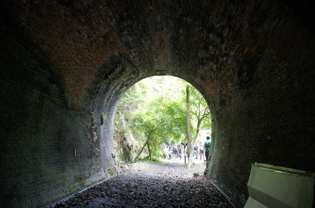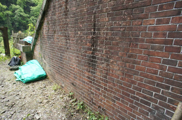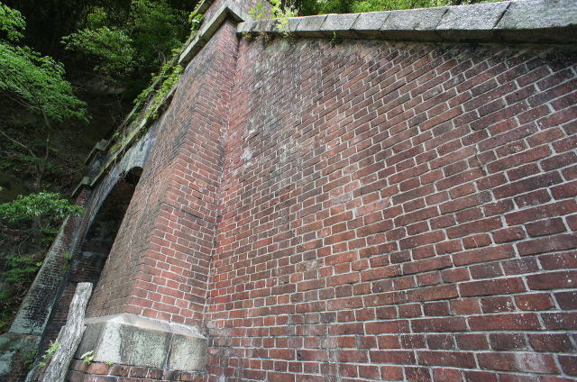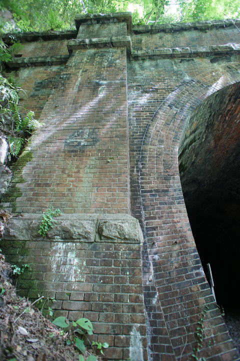 右側のウィング(翼壁)が特徴的な隠山第一トンネル。巻厚5層の煉瓦馬蹄型アーチです。