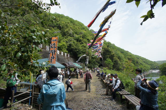 鯉のぼりが廃線跡の上を泳ぎ、その下で大勢の