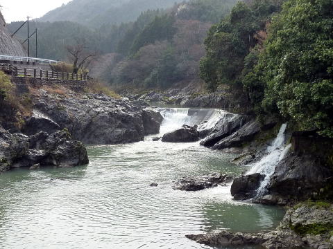 険しい自然の中通された県道と鉄道は、現在は何事も