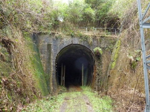 将軍青山トンネルの先鋒を務めるのは、 「梶ヶ広トンネル」 延長はヤフー地図で計測して350mぐらいではないで しょうか。。 煉瓦は使用されておらず、切石で構成されているよう です。切石の迫石が3層巻きされています。 |