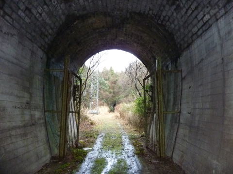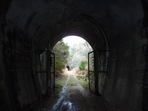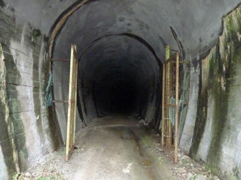 総谷トンネル。。。こっちも扉全開です。 梶ヶ広とおなじくらいの延長だと思いますが、こちらも 向こう側の光が届いていません。 |