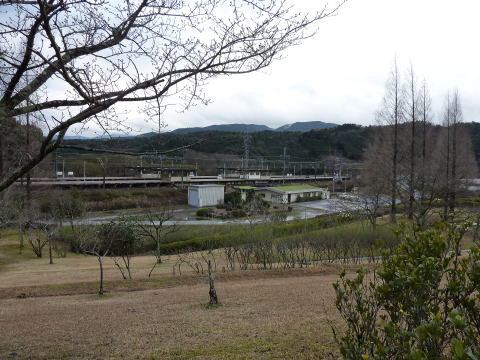 あちらが現行路線の東青山駅です。 結構なだらかではありますが山中に位置しますの で、駐車場はガランとしています。 |