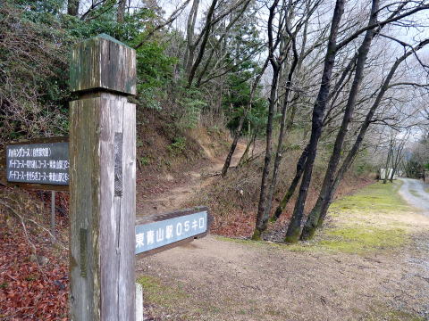 ゲートに背を向けて撮影。 東青山駅まで0.5km と、 ハイキングコース(左手の細道) の案内でした。 。。。当然というか、ゲート方面の案内板は出て おりません。 |