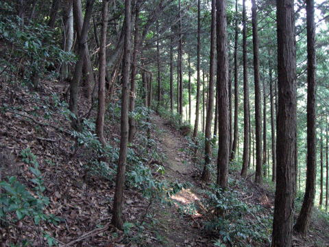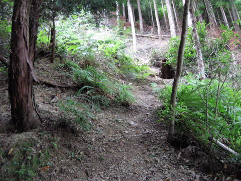 登山道から登ってきた獣道を見る。道幅歴然です ね。 |