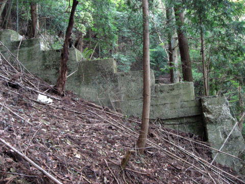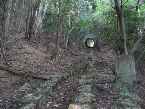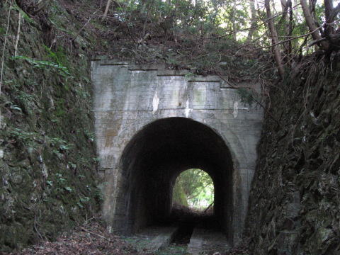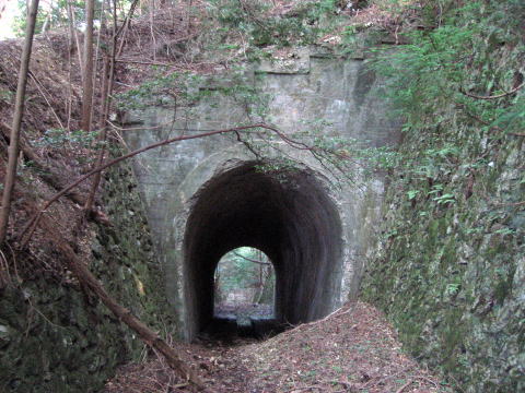 。。。なんて、お気づきだとは思いますが、トンネル の笠石部分の裏側ですよね。なんと真上に出ちゃっ たのです。 回りこむと、廃線跡の姿が見えてきました。 |