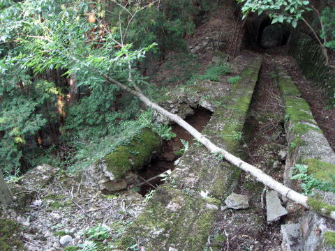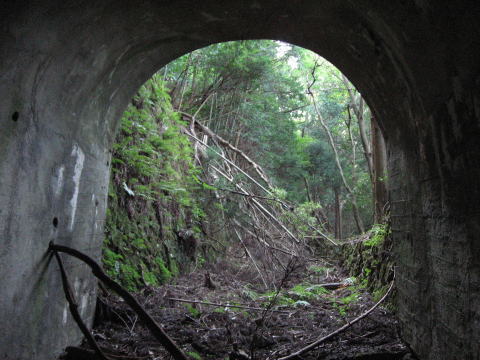 2本のコンクリはよととが乗ったぐらいではびくとも しませんでしたが、足早に崩落地点を抜け、反対側 よりトンネルを入れつつ撮影。 やはり、上に行くほど風化が進んでいます。 |