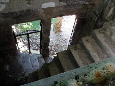廃墟探索は専門外ですが、折角なので見学しま した。2階から階段を見下ろす。 ※警告!:この建物、老朽はんぱでなく著しいため 本気で崩れる恐れがあります。 |
