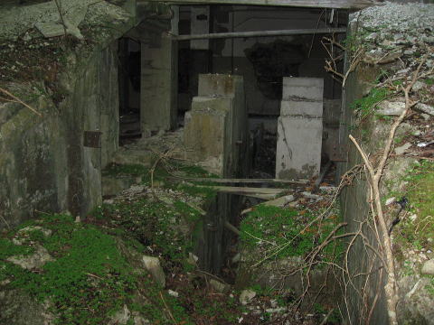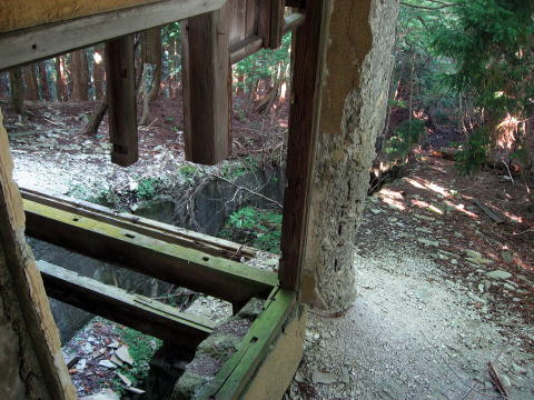 ケーブルカーが入るであろう中央部分には大きな 切れ込みがあり、奥手、ちょうど建物の真下にケーブ ルを巻きつける設備が残されています。 |