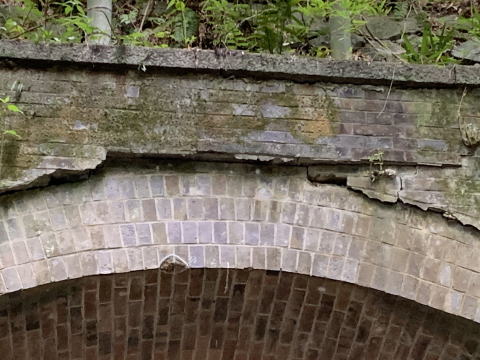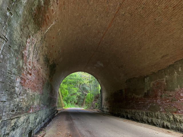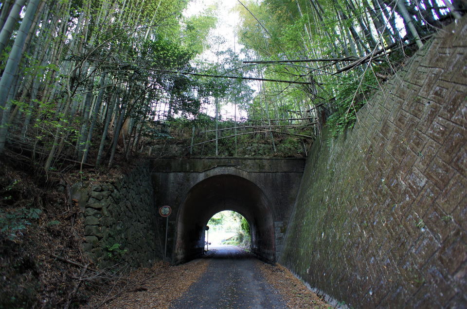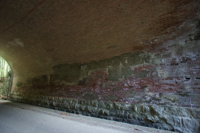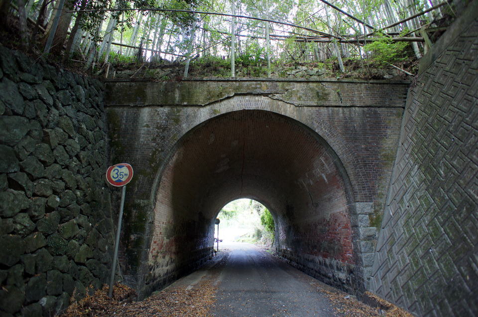 | 総煉瓦造りのループトンネルであり、現役ループトンネルとして現存最古と言われる。 鉄道路線含めて、煉瓦造りのループトンネルは他にあるのだろうか?ご存知の方、ご教示下さい。 巻厚4層の半円アーチ、笠石と隅石が切石になっている。両坑門とも帯石ラインに筋が入っているが、仕様ではなく亀裂と思われる。 側壁は下部に切石、上部に煉瓦を使っている。 尚、当路線は旧府県道時代の構造物と思われる石桁暗渠が多数残存している |