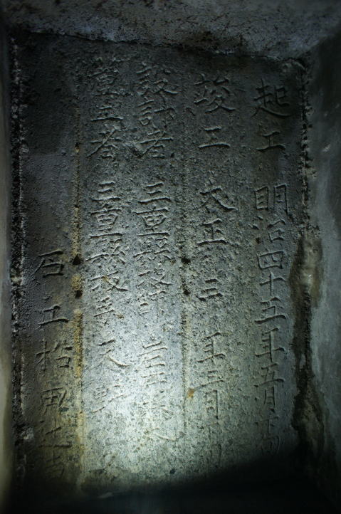 ![]() 起工 明治四十五年五月下旬 竣工 大正三年三月下旬 設計者 三重県技師 岩井 藤太郎 施工者 三重県技手 天野 久 石工 松田 辻𠮷 |