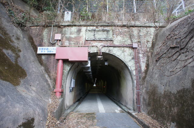 | 1909年度着工、1917年(大正6年)4月竣功の熊野街道大改修により誕生した煉瓦隧道。一連の事業で建造された6隧道の北から2番目 現在は古里歩道トンネルという名の通り、歩行者専用隧道になっている。平行する国道42号線のトンネルは古里トンネルである イギリス積みの坑門に扁額、隅石、楯状迫石、要石で構成される。内部は素掘りのようだが、モルタルで覆われている 三重県技師、岩井藤太郎氏の設計。銘板が洞内にある。他にモルタルで覆われた備品置き場?が残存する |