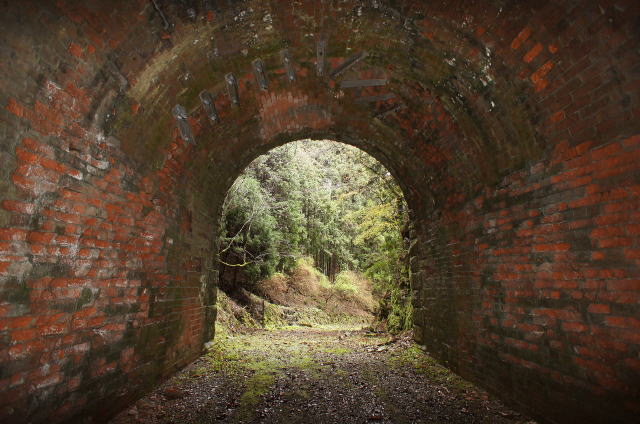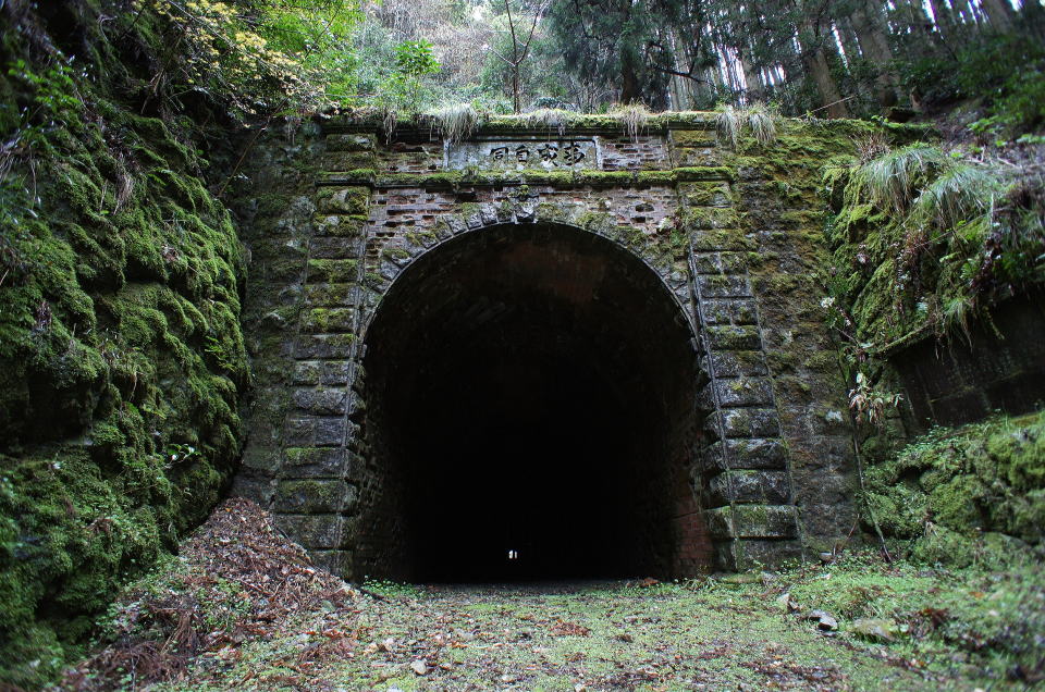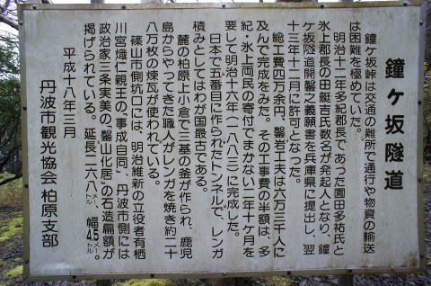 | かつては放置されて荒れ放題だったが、今は整備されており、誰でも訪れることが可能。 竣工から133年経過(2016年現在)している。 篠山側(多紀郡側)に立派な坑門を残す。扁額の下には鶴の彫り物もあり、珍しい。 「事成自同」の扁額。左端に「明治十六年九月」「熾仁書」と書かれている、と思われる。 有栖川宮熾仁(アリスガワノミヤタルヒト)親王は、ウィキペディアによると、有栖川宮第9代当主。 1835年(天保6年)−1895年(明治28年)享年61歳。明治16年竣功なので、49歳の頃の書とみられる。 柏原側(氷上郡側)は大部分がコンクリで覆われており、唯一扁額の周辺だけレンガ積みが顔を覗かせる。 「鑿山化居」の扁額。左端に「三條實美」(三条実美:サンジョウサネトミ)。さらに刻印が2つ。上は「甲斐國公裔孫」下は「藤原實美」と思われる。 三条実美はウィキペディアによると明治政府最高首脳人物の1人。 1837年(天保8年)−1891年(明治24年)享年55歳。明治16年竣功なので、47歳の頃の書とみられる。 洞内に「多紀、氷上群界」の銘板あり。 |