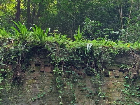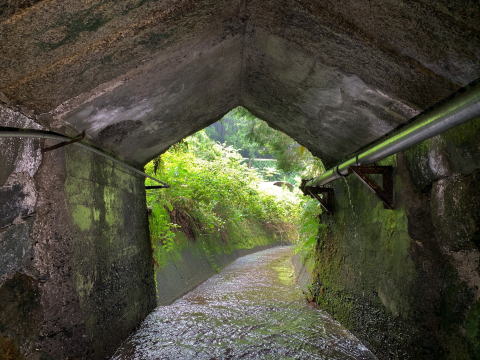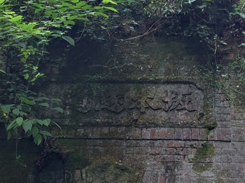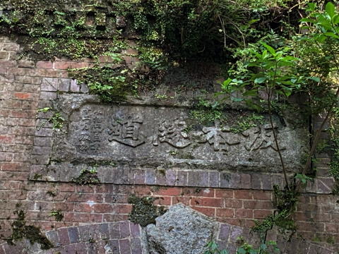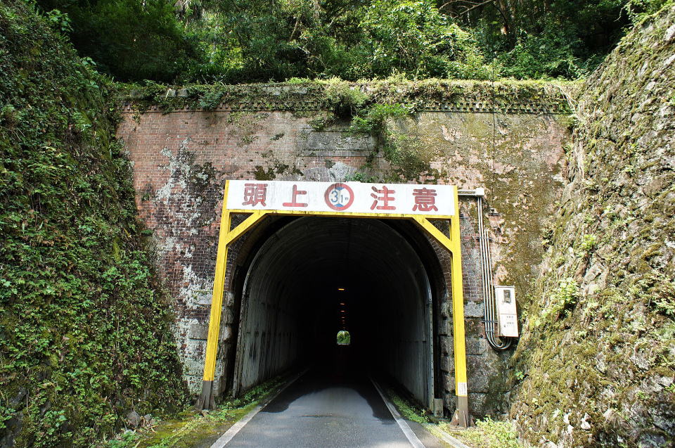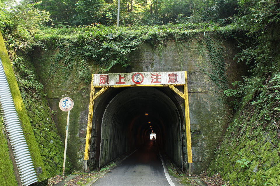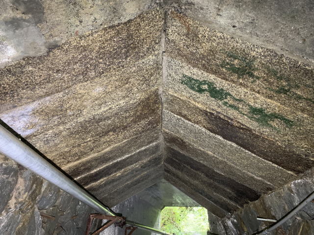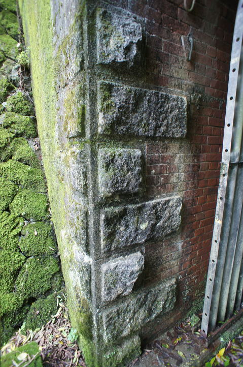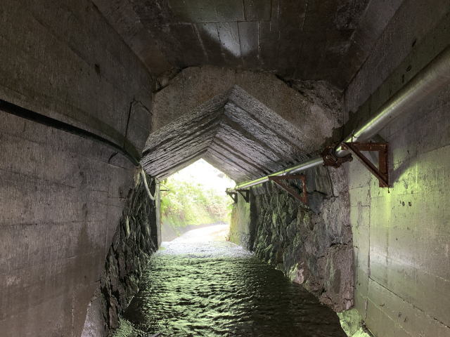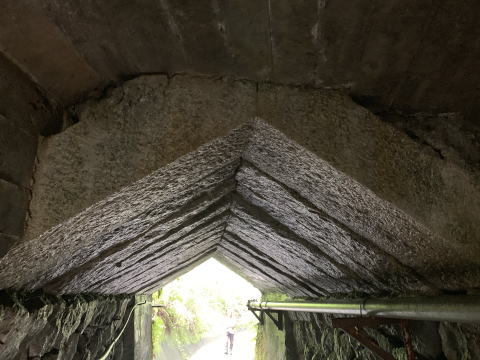 | 両側の扁額共に「坂本隧道」とあり、竣工年月日も読める。 アーチ環の巻厚は5層で、要石がある。扁額周りを小口煉瓦で装飾。笠石は切石で、下部に櫛歯(デンティル)の装飾がある。 内部は両坑門側がセントル巻き、大部分はコンクリ吹き付けにより従来の状態が分からない。 また西側の旧道に合掌石桁の暗渠を発見した。 |