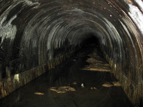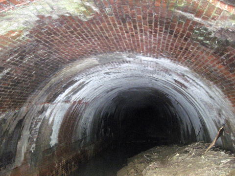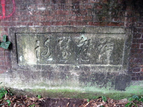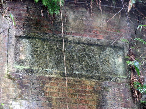 | 彦根側坑門は胸壁、翼壁ともにレンガ造りのイギリス積み。 要石と迫石、笠石に帯石も切石仕様。見た目にも豪華な一級品。扁額の文字は難解。 アーチ部はレンガ仕様の長手積み。水没しており、最深部で閉塞している。 一方長浜側は、帯石から下が埋没している。またも難解な扁額、胸壁、帯石は見ることができる。 ちなみに、掘り出してみようと試みても周辺の地盤は全てコンクリで蓋をされており、不可能である。 |