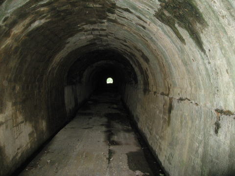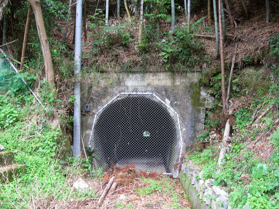 コンクリートブロック積みの坑門を有する昭和初期町道隧道。現在は内部で崩落しており、金網で封鎖している。