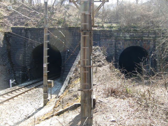 ![]() 初代と2代目が擁壁を挟んで一体化しています。うまく施工していますねえ。 昭和34年に開通する3代目ができるまでの間、初代が上り線、2代目が下り線で使用されていたようです。 |