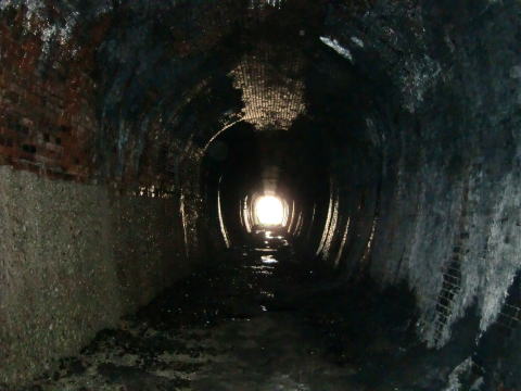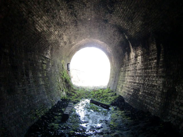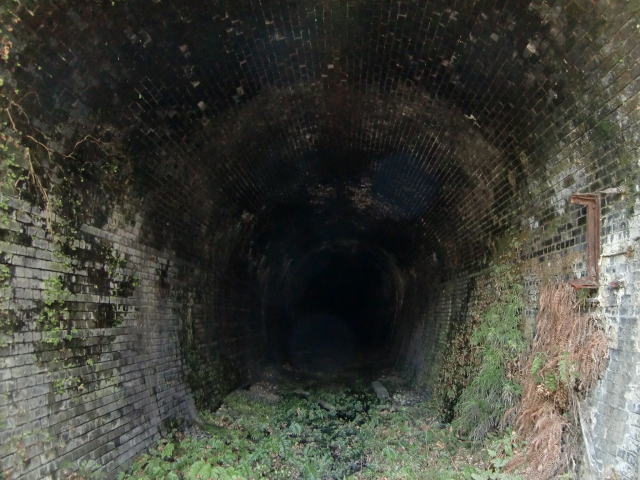 ![]() 内部です。坑門は切石積みでしたが、内部は全て煉瓦巻きとなっています。 2代目が1172m。この初代も1000mオーバーの長大トンネルとなっています。さて奥はどうなっているのか… |
