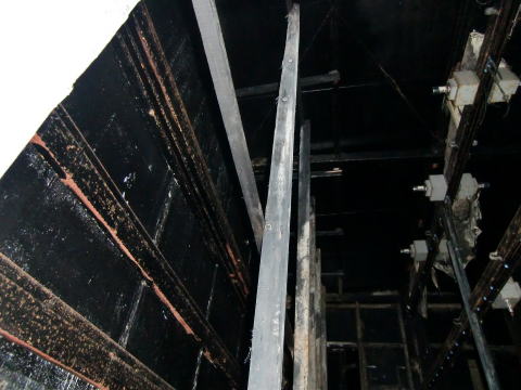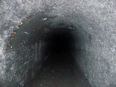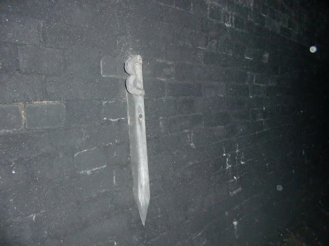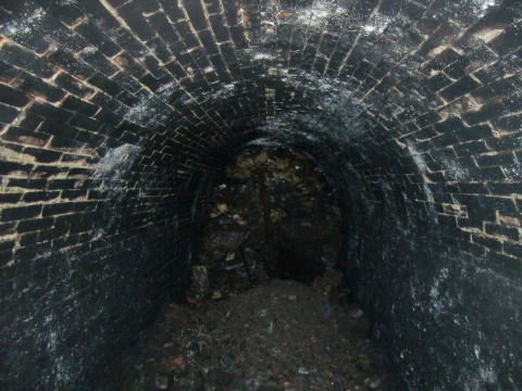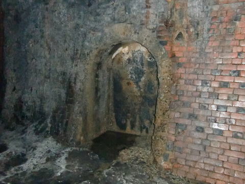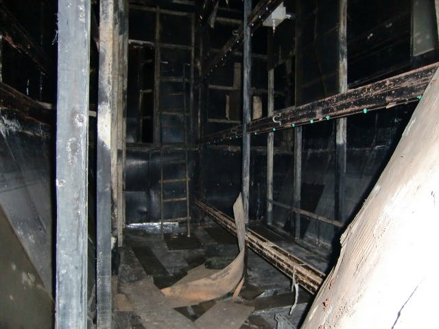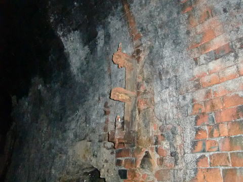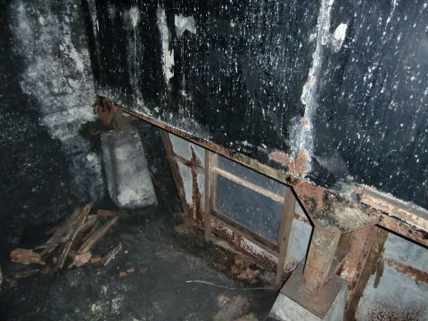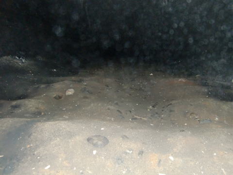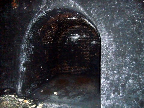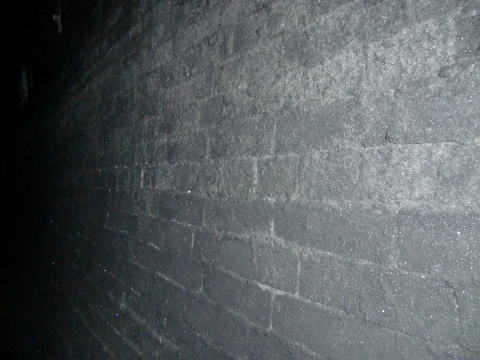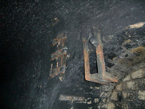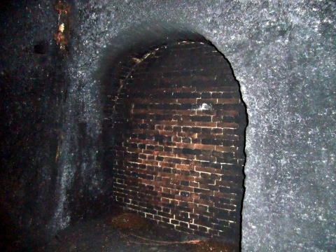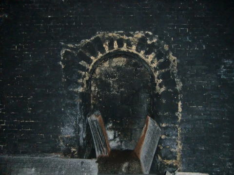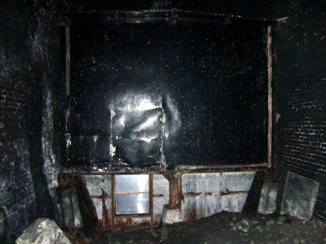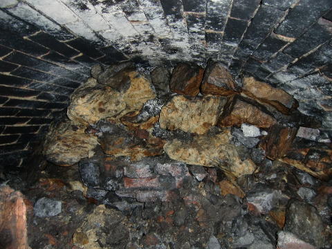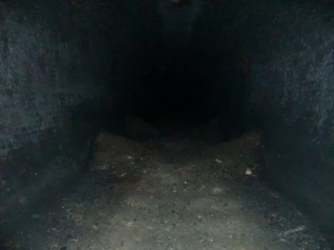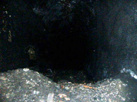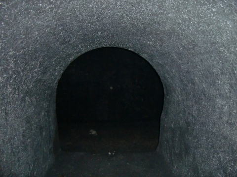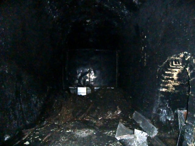 隙間から内部撮影。 煤で真っ黒ですな。光量不足で奥は確認できませ ん。 |