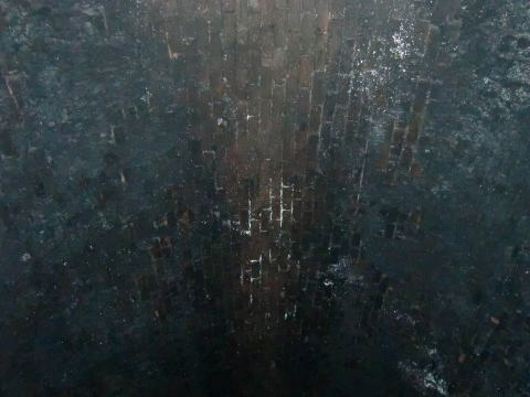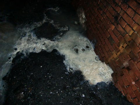 謎の流出物です。煉瓦の漆喰が流れ出たのか、 石灰性の物質なのか… |