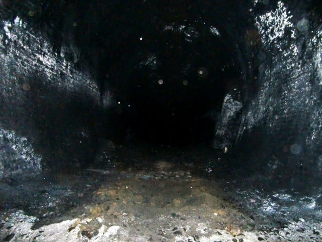 閉塞地点から振り返り。 横坑も煤まみれですな。 |