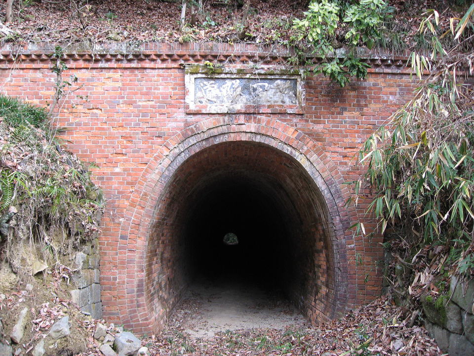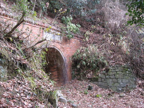 | 設計者:高橋市右衛門。総レンガ造りが現存する貴重な物件。 和歌山側坑口には扁額があり、「池田隧道」と読み取れる。帯石はないが笠石に特徴がある。 胸壁はイギリス積み。巻厚は3層である。一方、大阪側は扁額がないものの、代わりに帯石がある。胸壁はなんとフランス積み。同じ 隧道で、各坑口で積み方が違う隧道はあまりなく貴重。 特に管理されているようには見えないが、アーチも大部分が現存しており、かなり保存状態が良く感じられる。 |