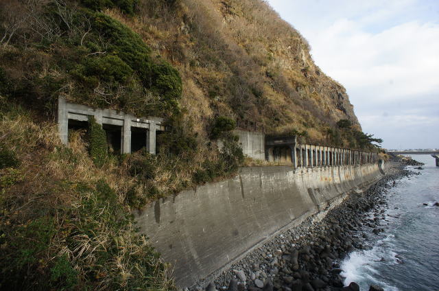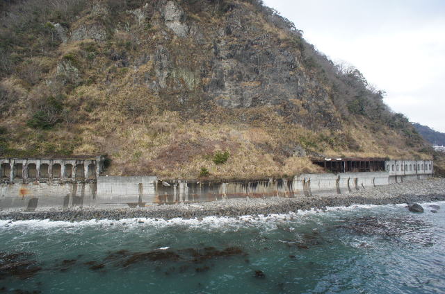 ![]() 海上橋があるからこその、この廃景! こちらが最も古い洞門のようです。いわゆる1号洞門ですな。右側の新しい5号洞門が潰れてこの1号洞門が無事… なんだか皮肉です。 それでもこの1号洞門の上にもかなりの土砂が堆積している模様です。崩壊も時間の問題かもしれません。 |