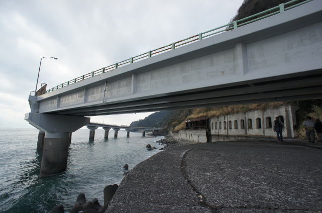 ![]() 逸る気持ちを抑え、まずは海上橋を歩いて対岸に向かいます。 対岸寄り、洞門の下にあるという四角い穴を調査しに行きます。 |