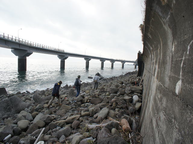 ![]() 波打ち際まで降りました。ここで見る限り、崩落の瓦礫の姿はありません。 全て波に浚われてしまった模様です。そう考えると新たな大規模な崩落は最近起きていないということでしょうか。 |