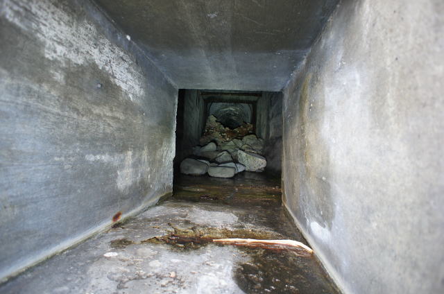 ![]() コンクリ面の所は、ちょうど車道洞門の真下でしょう。 ここから先は東海道本線石部トンネルの横坑ということになるんでしょうか。 |