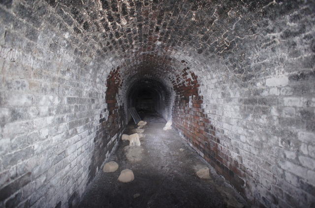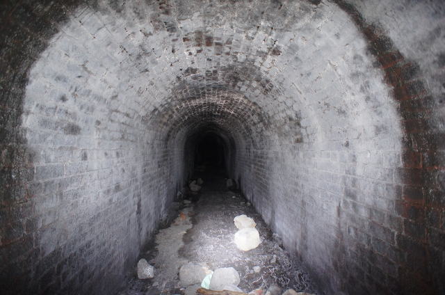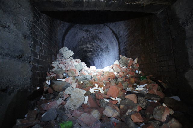 上部は煉瓦が崩れ、掘れ上がってますが、そこ まできっちり蓋をされています。 そこへちょうど列車の通る音が! 遠くで地鳴りのような音が聞こえ、遅れてどこから ともなく、ぶわっと空気の流れが頬をかすめます。 やはり貫通している模様です。 |