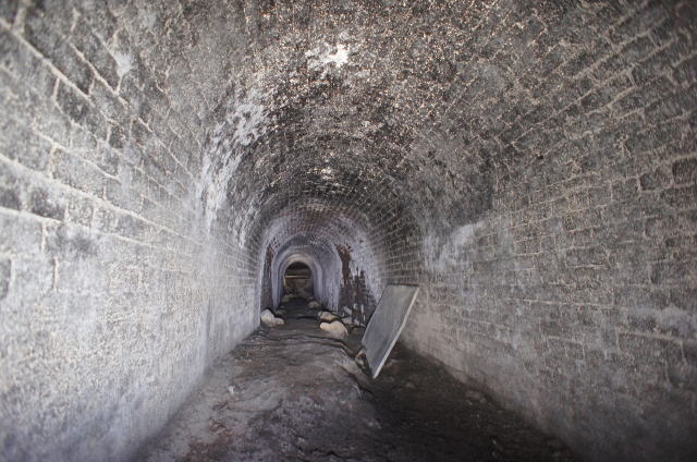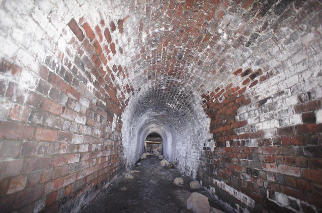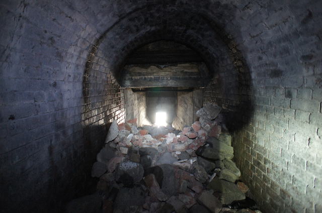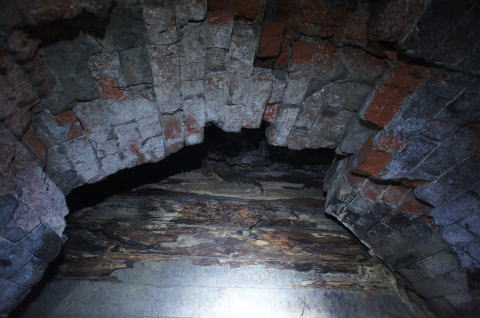 ![]() 内部をフラッシュ撮影… おおお!内部が広い!そして…奥にあるのは…煉瓦アーチ!!! 頭から滑り込むように潜入します。 |