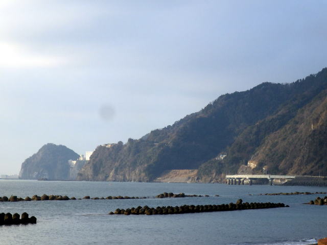 ![]() ズーム!!! 右手に石部海上橋が見えます。中央付近の造成された箇所がありますがあの辺りから磯浜トンネルとなって、 東海道本線は山に突っ込んでおりました。 |