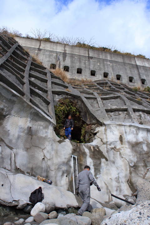 ![]() 海上道路橋の駐車場から、石部隧道を右手に護岸を歩きます。 ここから例の横坑に行けるそうです。 |