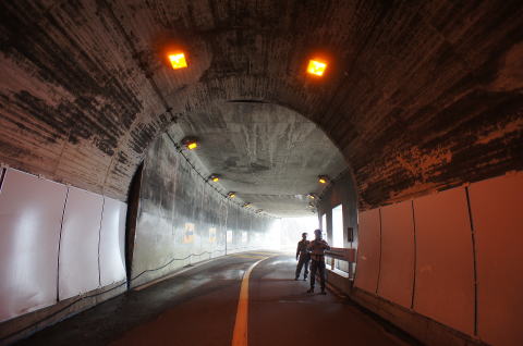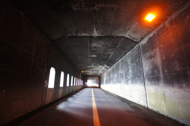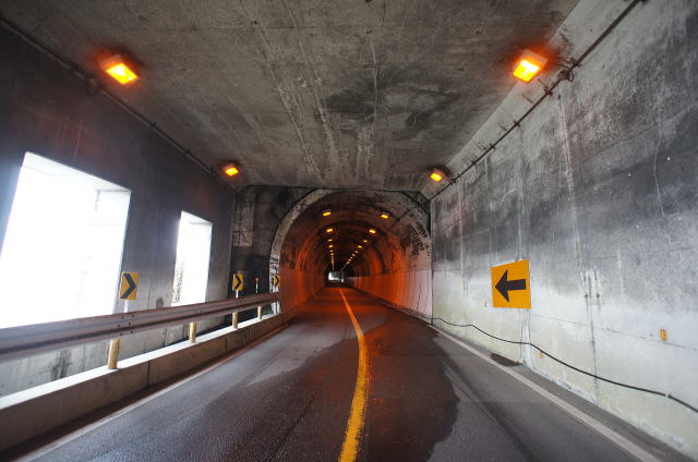 ![]() 反対側からも分厚い洞門がぴったりと隧道に張り付いています。 ここが幹線道路のままだったら、撮影困難度AAAの物件になっていたことでしょう。 ちなみにこの洞門も海上道路橋建設と共に新設されたもののようで、以前は第六、第七洞門があったそうです。 |