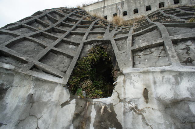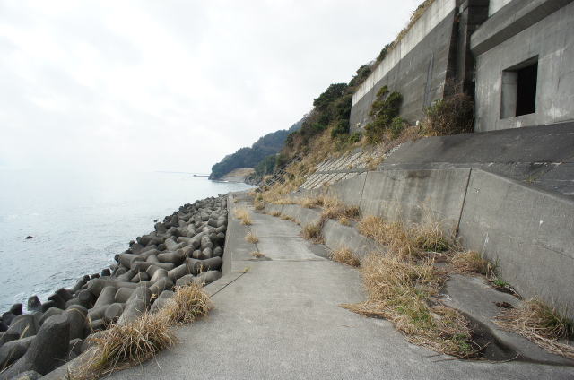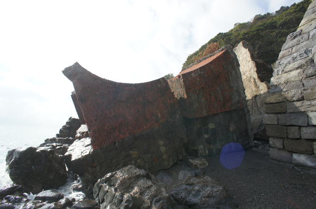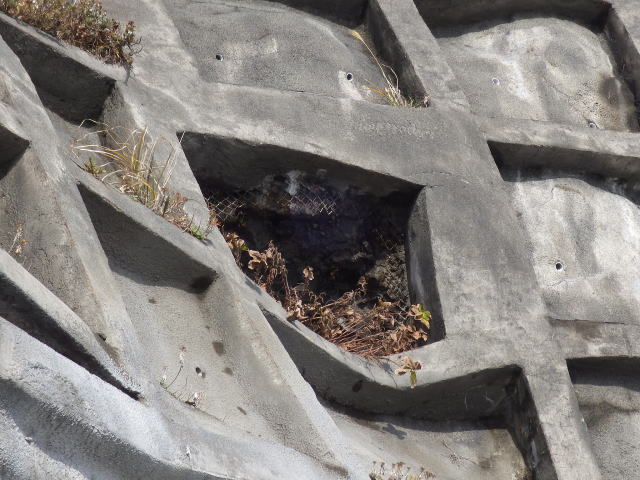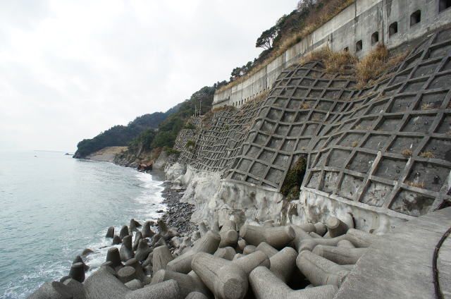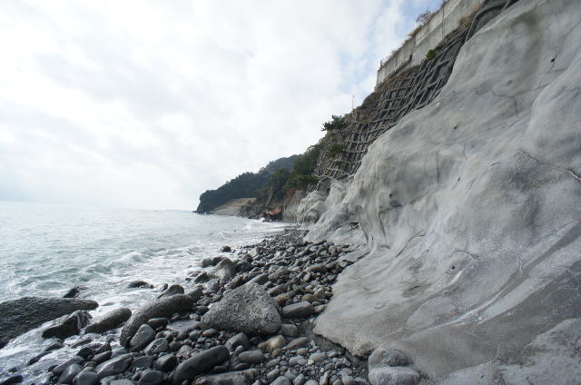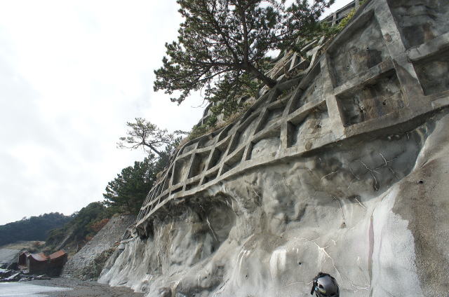 ![]() 地形に沿って、よくここまで塗り固めたものです。 潮による浸食もこれで大分防げそうです。 |