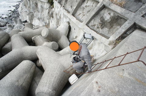 護岸から消波ブロックにはこのような階段が 設置されていました。 しかし鉄筋製ながらほっそいはしごです。すん ごいたわみます… とのたまさんが秘密道具の脚立を担いで降り ます。 |
