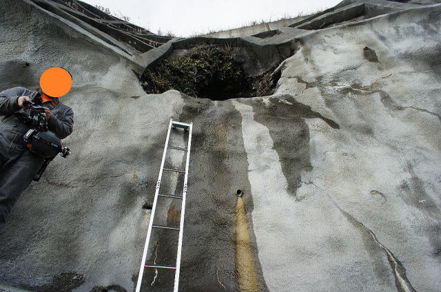![]() 一見しただけは気付けないような状態で穴が開いています。 なんちゅうところに… しかしことごとく穴はあけたままなんですな… で、アプローチは、外側からだとかなり危険です。しかし、安心してください!内部から入れますよ! ってなわけでお預けです。 |