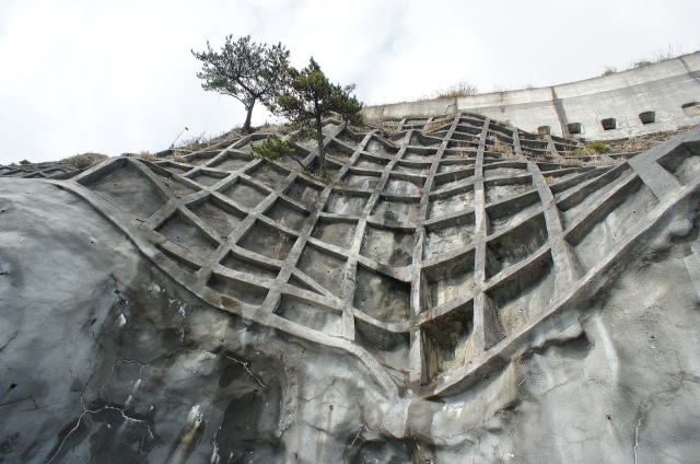 ![]() 見上げると、すんごい光景が広がっています。 塗り固められた絶壁に松が2本。うーむ…シュールです… |