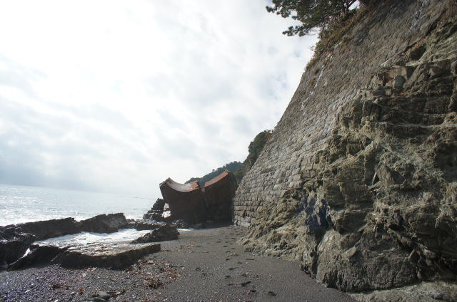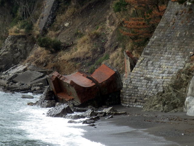 ![]() 途切れる護岸。そこからは消波ブロック、波打ち際を歩くことになります。 ここは潮の加減で歩けたり歩けなかったりするそうです。只今の時刻、9時54分。今は潮が引いている模様です。 ここで気になるものが2つ。 一つは右手法面に開く穴。そして中央左寄り、目線の先には… |