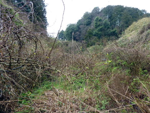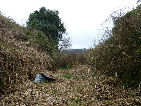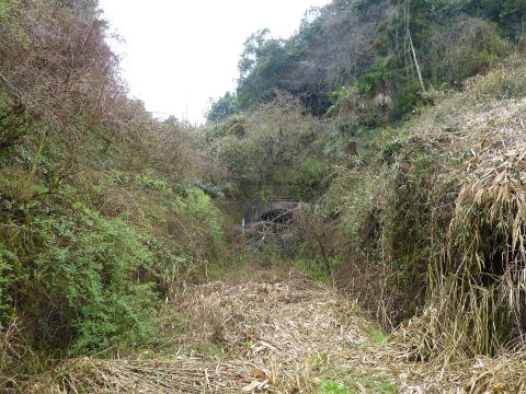 現行トンネルから右に目をやると、枯れ草に覆われつ つも、掘り割りのようなスペースがうっすら見てとれます。 当然この先に待っておるのでしょう。。。 |