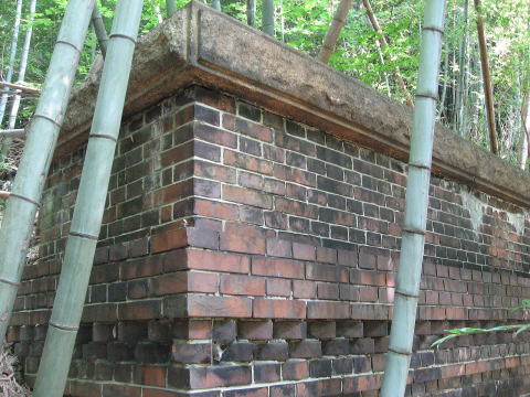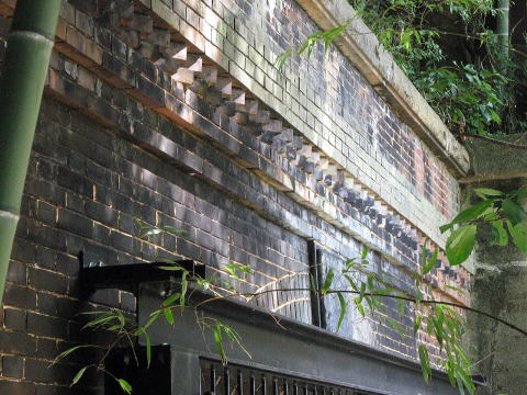 うーむ、すごいですねえ。 帯石は、上部から煉瓦4段、雁木2段、煉瓦2段、 煉瓦2段と、合計10段分の厚みが装飾的に配置され ています。 笠石と帯石の間を胸壁(むねかべ)というそうですが、 そこはイギリス積み、帯石より下部にはフランス積みと 異なった積み方を配しています。 |