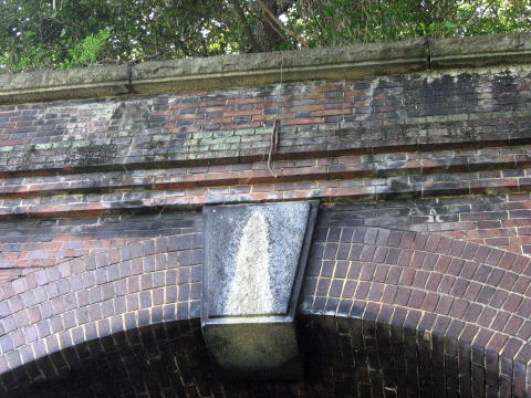 かなり装飾的です。さすがのかつての国鉄路線と いうことでしょうか。 笠石と要石には切石を使用、煉瓦仕様の帯石下部 には雁木(がんぎ)と呼ばれる斜め煉瓦配置を採用し ています。 |