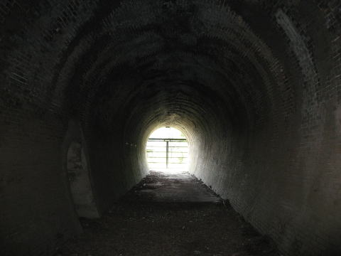 左にやや曲がっているからか、反対側の光は見え ません。現役トンネルと同じぐらいの延長でしょうから、 200mぐらいだと思われます。 |