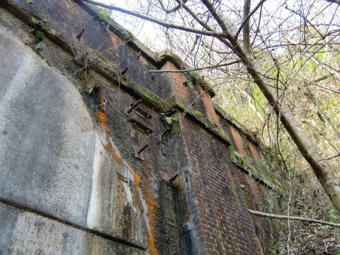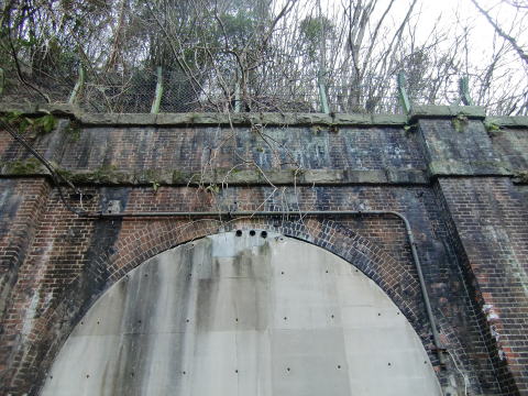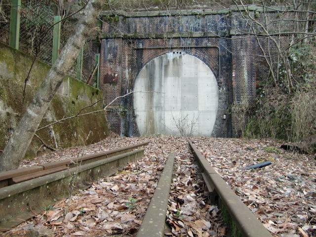 巻厚4層の単線馬蹄型アーチという典型鉄道煉瓦 トンネルです。 ピラスターがあり、坑門、胸壁ともにイギリス積み。 笠石帯石を備え、全てにおいてスタンダードなトンネ ルと言えます。 坑口は新しめのコンクリートで塞がれ、上部に空気 抜きと思われる穴が3つ開いています。 開口中に内部に入った方はおられるんでしょうか。 ネットでは封鎖写真しか見当たりません。 |