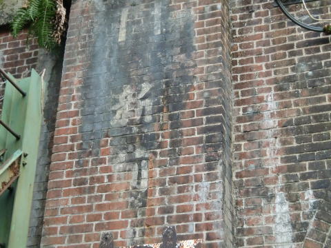見事な煉瓦橋台です。 あそこからここまで、大きな橋梁でここまで鉄道が やってくるわけです。開設は明治ということですから、 その当時の工事の大変さが見て取れます。 |