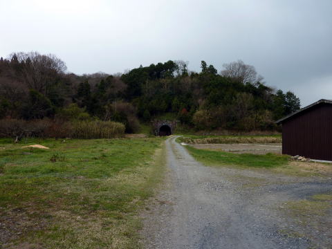 砂地の道がそのままトンネルに繋がるかと思いきや、 寸前で右に逸れました。 それにしても低い峰です。現在線は右の建物の向こう 側、峰の途切れた場所を通過しています。旧線があえて こちらのルートを採る理由は何だったのでしょうか。 |