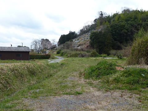 踏み切りを渡ると。。。をを。。。遠くに穴の姿が見えま す。 右手にゲートボール場、左手の斜面に墓地という位置 関係の奥手にトンネルの姿を見ることができます。 |