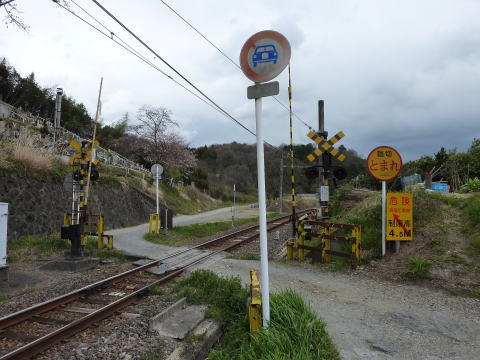右に逸れた砂利道はまたも車が通行できない踏み切り を渡ります。(写真は一度渡ってから振り返り撮影) 他に抜ける道は無く、原則あの場所は車の進入がで きないことになります。 |