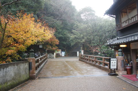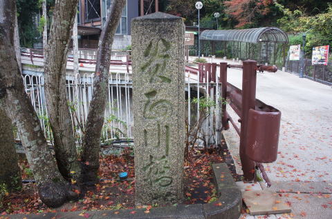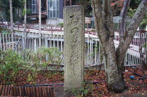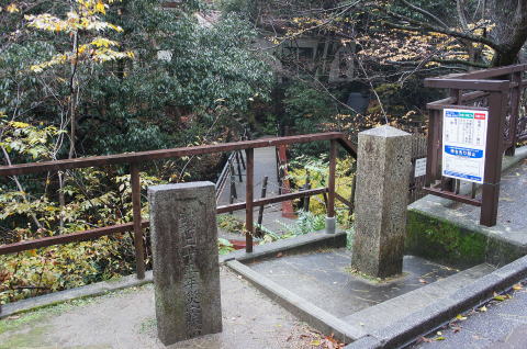 「名勝 箕面山」 「昭和二十五年災害復旧〜」 の石碑が。 この場所に当初の箕面動物園の入り口があった ようで、蓬莱橋という名の橋梁が架かっていた そうです。不老門も有名ですが、現在は影も形も ありません。 |