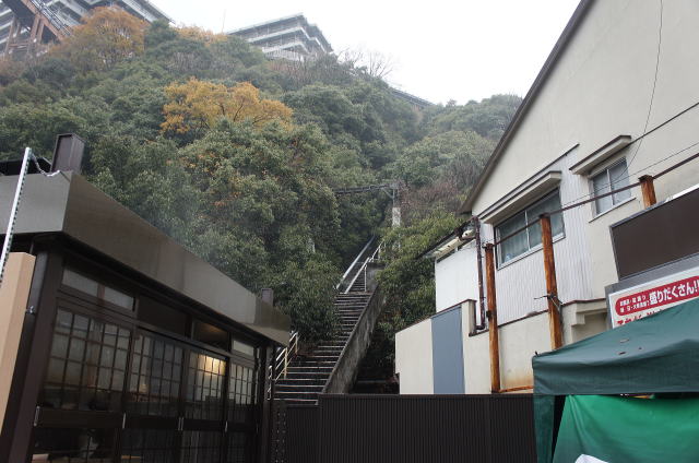 おおお…これは! そう、ケーブルカーの軌道です。 なんと延長100mという超短軌道ながら、ちゃん と箕面鋼索鉄道というかつての地方鉄道法に 基づく正規の鉄道だったそうです。 大阪観光の運営で1965年(昭和40年)10月1日 に開業、廃止は1993年(平成5年)7月30日だそ うです。老朽化が廃止理由のようです。 現在は代わりにエレベーターが設置されていま す。 |